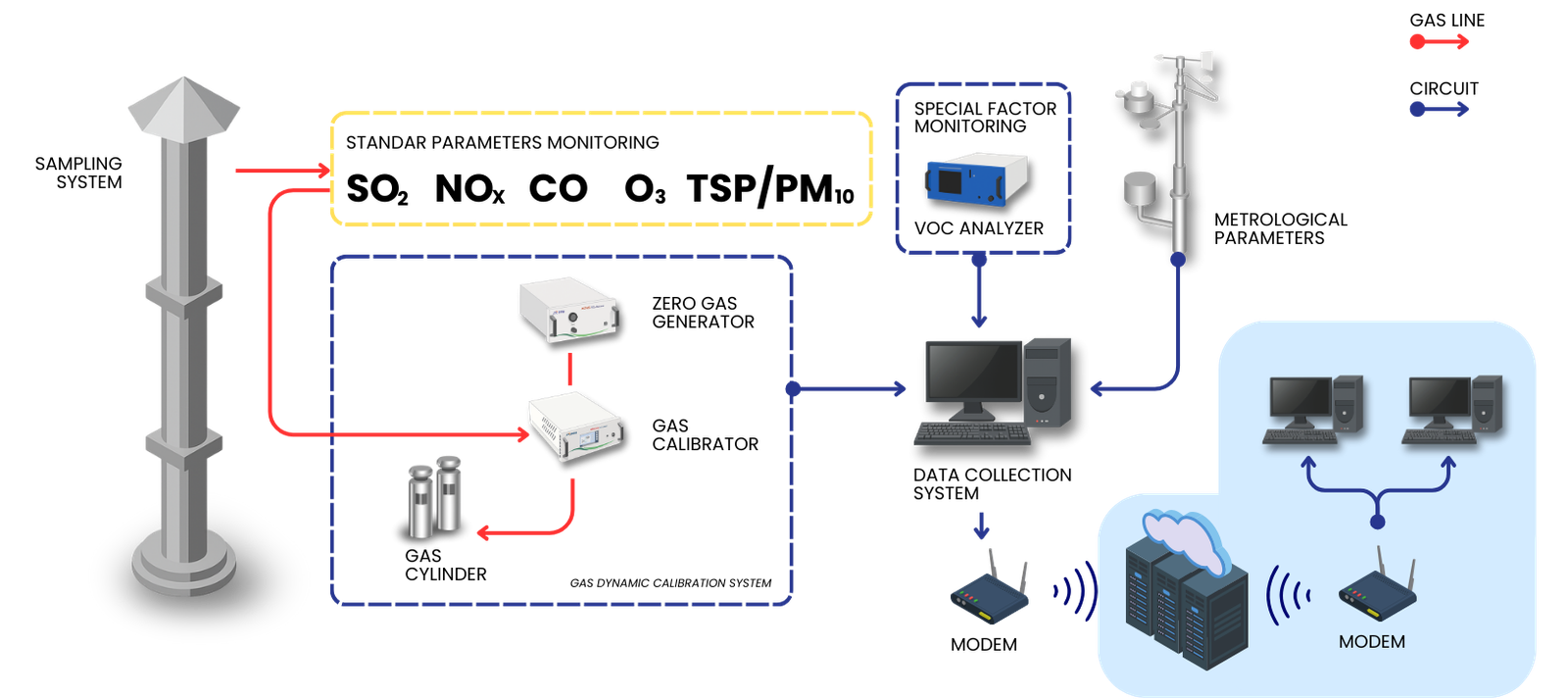 Continuous Emission Monitoring System (CEMS) bekerja dengan mengambil sampel langsung dari cerobong industri, menganalisis kandungan gas buang melalui perangkat analyzer yang terkalibrasi, serta mengintegrasikan data lingkungan seperti arah dan kecepatan angin.