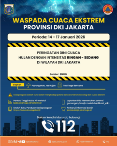 Badan Penanggulangan Bencana Daerah (BPBD) DKI Jakarta mengeluarkan peringatan dini potensi hujan yang diperkirakan terjadi di wilayah Jakarta pada periode 14–17 Januari 2026. Hujan diprediksi turun dengan intensitas ringan hingga sedang dan berpotensi terjadi secara merata di beberapa wilayah ibu kota hal ini disampaikan berdasarkan informasi akun instagram resmi @bpbddkijakarta, Senin (12/1)