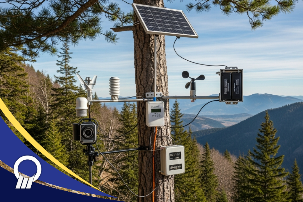 - perangkat komunikasi: biasanya berupa modul jaringan berbasis LoRaWAN, LTE, atau satelit untuk mengirimkan data dari area pegunungan yang jauh dari pusat kota.