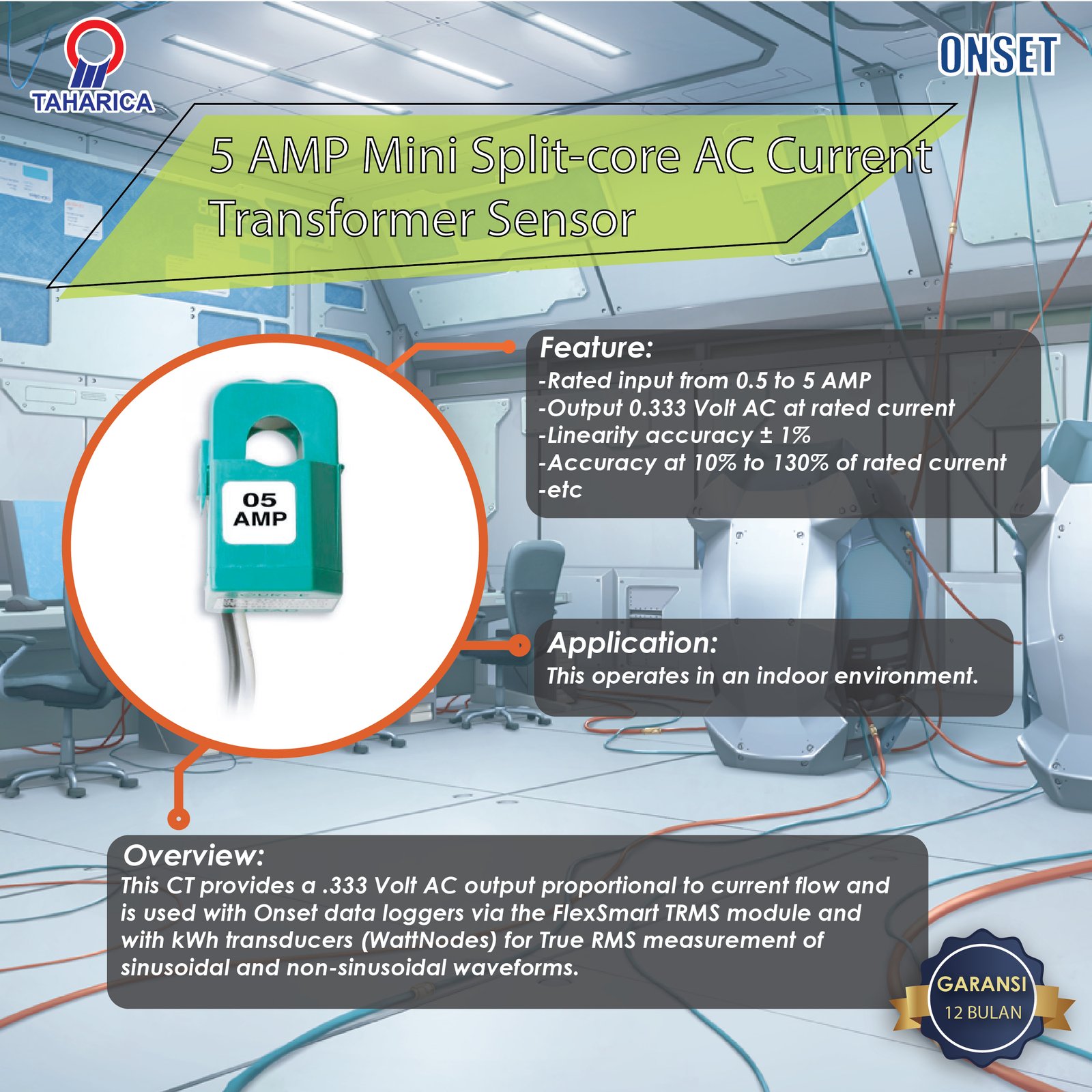 The small size 5 AMP split-core AC Current Transformer (CT) is mounted around a current carrying wire to measure AC amperage. This CT provides a .333 Volt AC output proportional to current flow and is used with Onset data loggers via the FlexSmart TRMS module and with kWh transducers (WattNodes) for True RMS measurement of sinusoidal and non-sinusoidal waveforms. The result is an accurate current measurement for many types of electrical equipment.