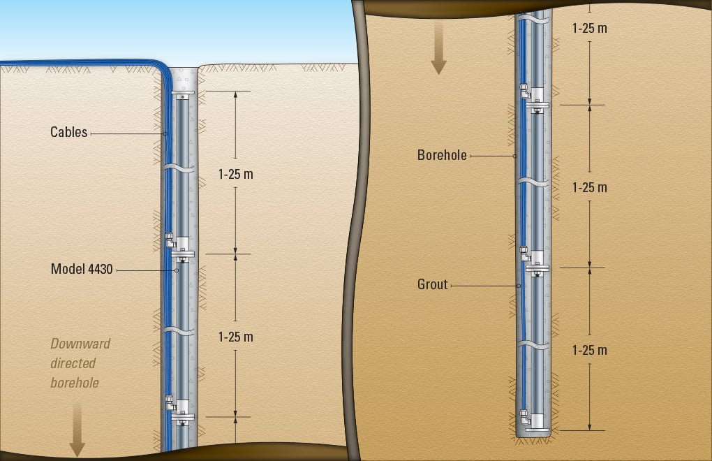 Model 4430 Deformation Meter dengan ujung flens dirancang untuk mengukur deformasi longitudinal pada bendungan dan tanggul. Ini juga dapat di-grout atau ditahan di tempat oleh jangkar hidrolik untuk mengukur deformasi di lubang bor (melebihi panjang pengukur). Panjang pengukur dari 0,5 hingga 100 meter tersedia.