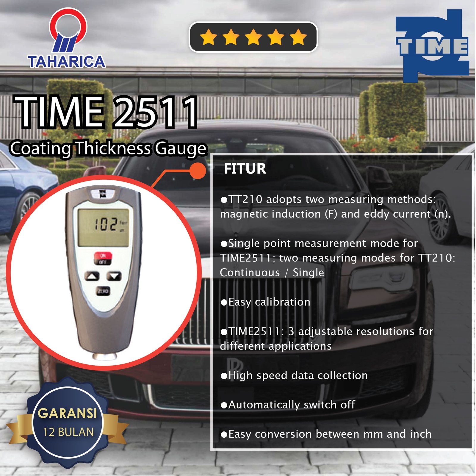 TIME®2511 is the most economical digital coating thickness gauge that uses magnetic induction method to measure non-magnetic coatings (e.g. paint, plastic, porcelain enamel, copper, zinc, aluminum, chrome etc.) on ferrous substrates (e.g. iron, nickel etc.). This paint thickness meter is ideal for painted surface testing, car paint inspection, coated material testing, and quality control applications.