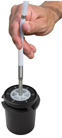 The Micro DVP uses coaxial PTFE tubing in lengths of 90 ft, 140 ft, and 240 ft. The pump body and filter assembly is 6″ long x 3/8″ diameter (150 mm x 10 mm). It is constructed of coaxial PTFE tubing with stainless steel fittings and a sintered 316 stainless steel 50 micron filter. Filters are easily cleaned and replaced. A manifold at the top end of the pump has a 3/16″ (5 mm) PTFE sample tube and a quick-connect fitting for easy attachment to a Control Unit. A multi-purge sampling head is also available for use with the CMT System.