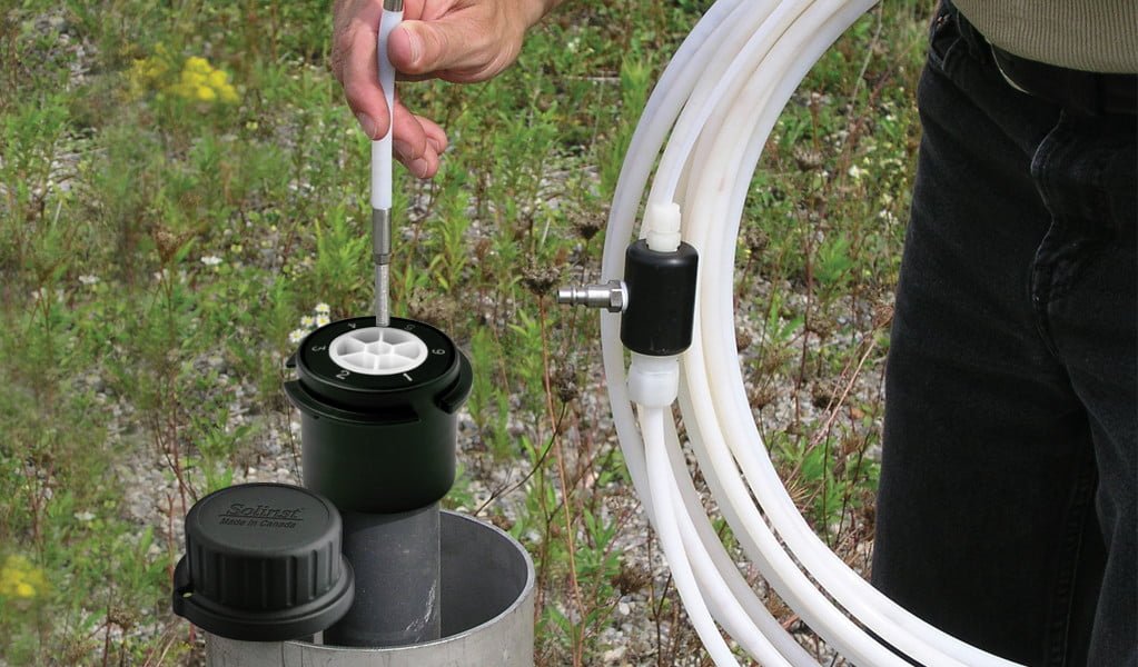 The Micro Double Valve Pump (Micro DVP) has a remarkably small and flexible design. As a positive displacement pneumatic pump, it uses coaxial PTFE tubing to give high quality samples. It is small enough to fit in 1/2″ (13 mm) tubing and all channels of the Solinst Model 403 CMT Systems, as its diameter is only 3/8″ (10 mm). The unique combination of flexibility and size make the pump easy to transport and install in a variety of applications.
