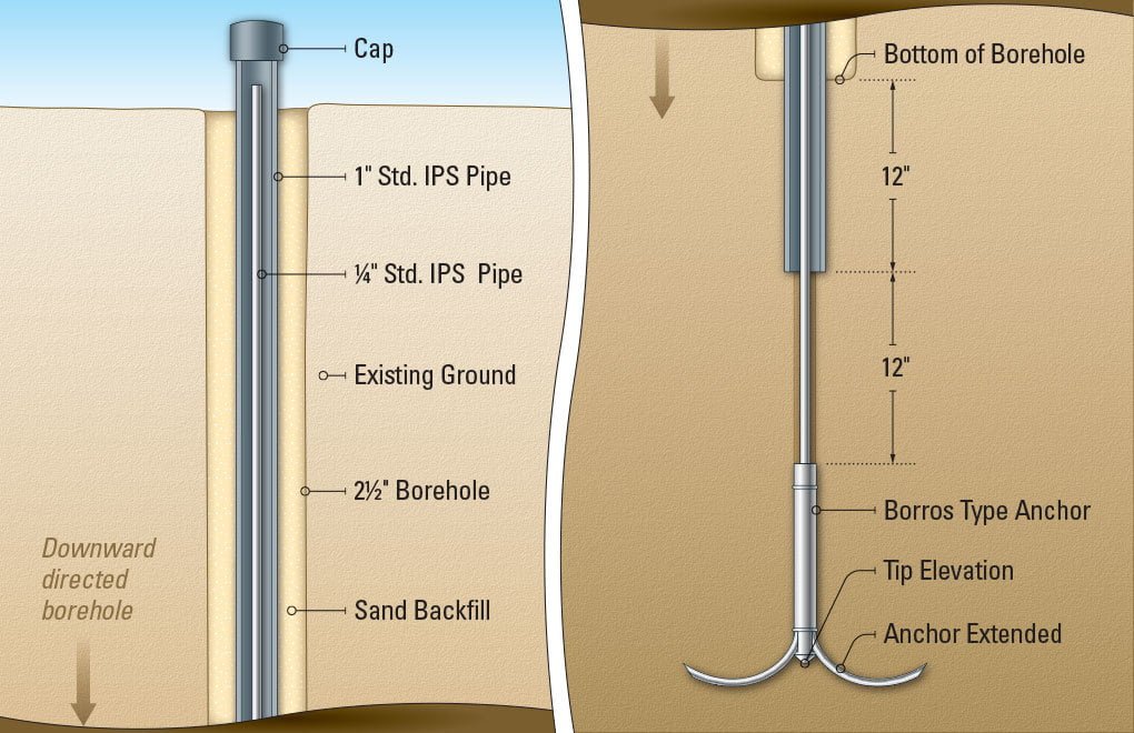 Tujuan dari heave / settlement points adalah untuk mengukur pergerakan vertikal pada tanah pondasi selama, dan sesudahnya, konstruksi. Titik naik / turun terdiri dari jangkar tiga cabang, pipa dalam standar ¼ “, dan pipa luar standar 1”. Pipa-pipa tersebut dirakit dalam beberapa bagian dan diikat bersama dengan kopling standar ke kedalaman jangkar yang diperlukan.