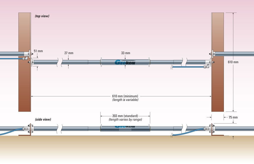 Model 4435 Soil Extensometer dirancang untuk dipasang secara seri, untuk mengukur regangan horizontal dalam timbunan tanah atau bendungan batuan. Model 4435 memiliki flensa di kedua ujungnya, yang memungkinkan serangkaian ekstensometer untuk dibaut bersama-sama membentuk rangkaian panjang sensor sehingga tampilan lengkap deformasi atau penyelesaian dapat dipantau. Untuk pengukuran regangan pada lubang bor dan bendungan RCC, silahkan lihat Meter Model Deformasi 4430.