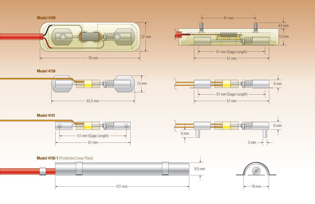 Strain Gauge Model 4100/4150 memiliki panjang gauge 51 mm (rentang 3000 με, sensitivitas 1 με) dan dirancang untuk mengukur regangan pada struktur baja (4100) dan pada tulangan penguat (4150) di mana ruang mungkin terbatas. Pengukur dipasang dengan cepat dan mudah melalui tukang las titik pembuangan kapasitif atau, untuk penggunaan jangka pendek, dengan perekat epoksi khusus; metode lampiran yang terakhir memungkinkan penggunaan pengukur ini pada beton.